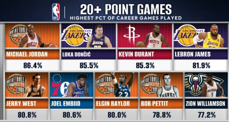 伟德体育-历史20+场数占比:乔丹86.4%第1 东契奇2KD3詹姆斯4恩比德6锡安9
